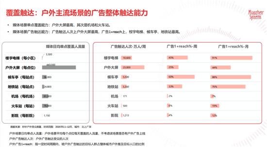 根據(jù)受眾觸媒習(xí)慣基礎(chǔ)調(diào)研數(shù)據(jù)顯示,從媒體場景單點(diǎn)覆蓋能力來看,戶外大屏的覆蓋能力最高,其次是機(jī)場和火車站;同樣,戶外大屏在廣告觸達(dá)人次上最高,但在廣告1+reach上(指一定周期內(nèi),被戶外廣告觸達(dá)的目標(biāo)人群占整體城市戶外推及目標(biāo)人口比例),樓宇電梯、候車亭、地鐵最高。