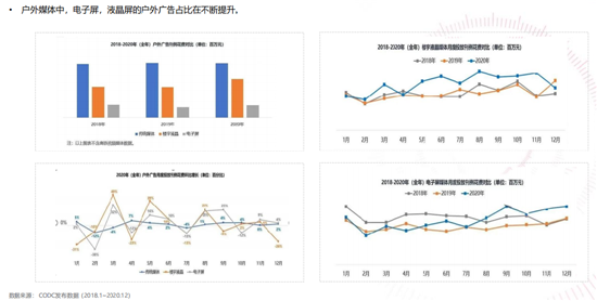 近年來,電子屏、液晶屏的戶外廣告占比在不斷提升,根據(jù)統(tǒng)計(jì),電子屏媒體月度投放刊例花費(fèi)同比顯著上升,2020年全年戶外廣告月度投放刊例花費(fèi)環(huán)比增長由2019年的-26%上升至4%。