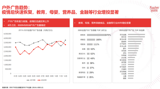 秒針系統(tǒng)戶外受眾測量及秒針系統(tǒng)戶外監(jiān)播數(shù)據(jù)顯示,2020年全國戶外廣告增幅最高的前三個行業(yè)分別為教育類(370%)、保健品(160%)及母嬰類(111%),增幅均超過100%,足以證明這三個行業(yè)對戶外場景效果的認(rèn)可以及對戶外廣告的積極信心。