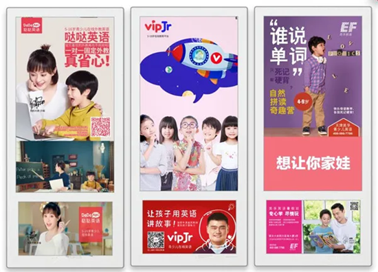 由于線上教育品牌的受眾主要是青少年兒童,社區(qū)類戶外媒體能夠幫助它們更快、更精準(zhǔn)地觸達(dá)到受眾群體。基于此點(diǎn),學(xué)而思、跟誰學(xué)、新東方、VIPKID等一大批針對K12教育的品牌,先后登陸社區(qū)梯媒,選擇靠近中產(chǎn)家庭的社區(qū)電梯電視進(jìn)行廣告投放,看中的正是電梯作為“最靠近消費(fèi)者最后一公里”媒體和自身產(chǎn)品的目標(biāo)受眾、使用場景的高契合度。通過“家”場景,成功觸達(dá)目標(biāo)受眾,影響消費(fèi)決策。